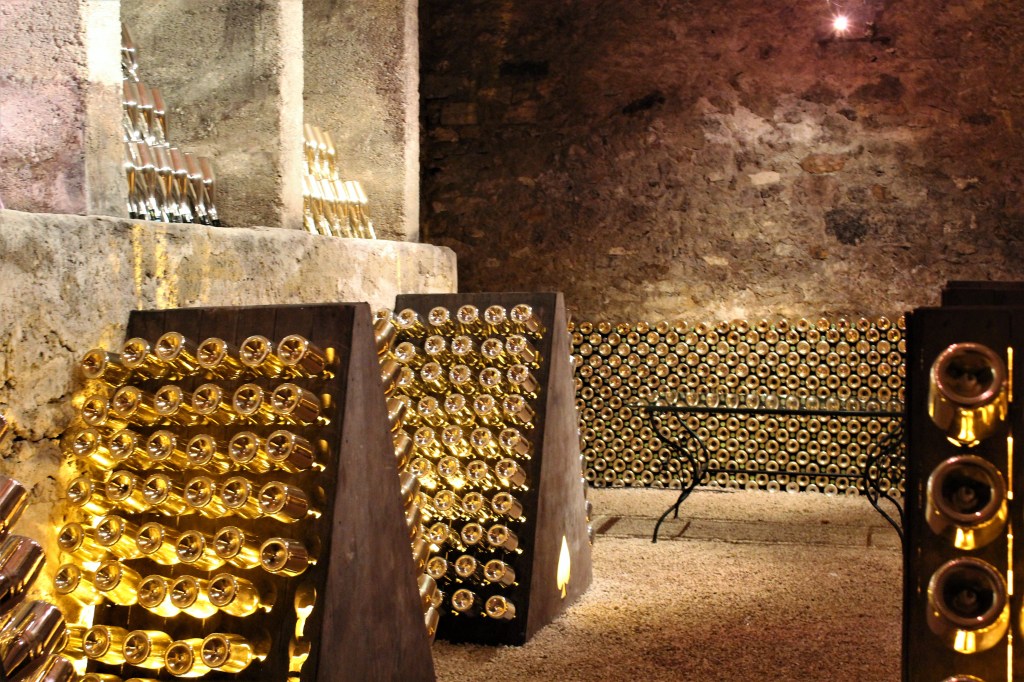 Bottles of Champagne in a cellar in Champagne, France